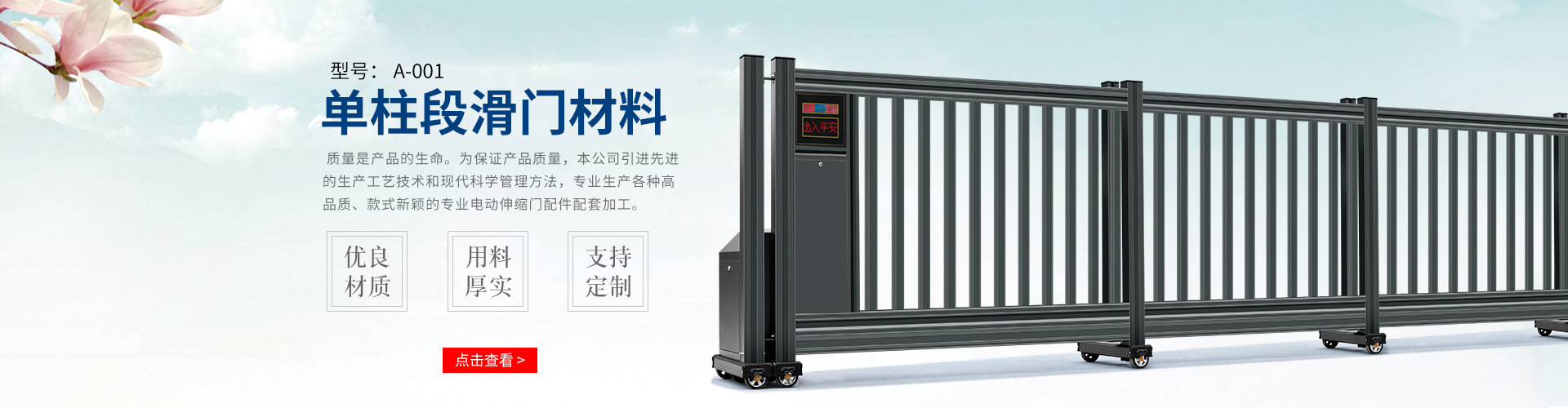佛山市鴻湛源金屬制品有限公司,坐落于廣東省佛山市三水區,占地面積 7000 平方米,是專業生產智能廣告小門、智能段滑門,直線門配件、配套散件、鑄鋁件等產品為主的企業。本公司擁有多年的制造經驗,引進先進的生產工藝技術和現代科學管理方法,專業生產各種高品質、款式新穎的專業電動段滑門配件配套加工企業。 佛山市鴻湛源金屬制品有限公司始建2006 年并于 2013 年注冊成立,在這 13 年間,始終堅持以人為本,堅持科技創新,并從細節入手、從點滴做起,把精工細作的精神滲透到每一個生產環節,傾力打造好產品、創品牌。同時企業精心營造濃郁的“忠誠”文化,在企業、客戶和員工之間構筑起誠信、忠實、和諧的紐帶,攜手發展共創輝煌。 本企業承諾將一如既往,重守誠信,精益求精。秉承團結開拓求實的敬業精神,與廣大新老客戶共創美好明天。